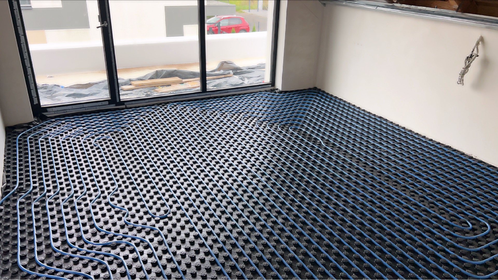 Ogrzewanie podłogowe wykonane w pełnym pokryciu powierzchni – gęsty, równy rozstaw pętli z zagęszczeniem przy przeszkleniach. Układ przygotowany pod stabilną temperaturę i komfort w całym pomieszczeniu.