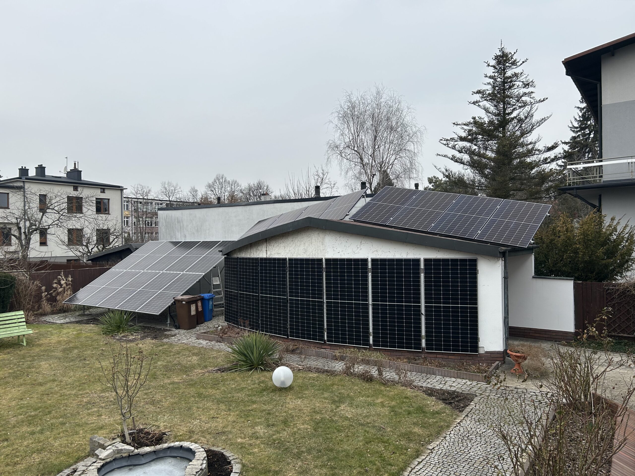 Rozbudowana instalacja PV maksymalizująca uzysk na dostępnej przestrzeni: moduły na dachu budynku, pionowo na elewacji oraz dodatkowy stelaż gruntowy. Układ dobrany tak, aby wykorzystać różne ekspozycje i ograniczyć straty przy mniej korzystnych warunkach nasłonecznienia.
